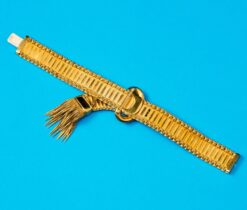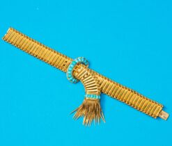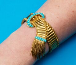 Een 18 karaat geelgouden gesp armband. De band bestaat uit gesatineerde staafschakels met aan weerszijde een dubbele rand. in het midden is en ovale gesp met 13 cabochon geslepen turkooizen. Eindigend in brede geribde band met 7 cabochon geslepen turkooizen en kwast met puntpampeltjes. in orgineel etui.