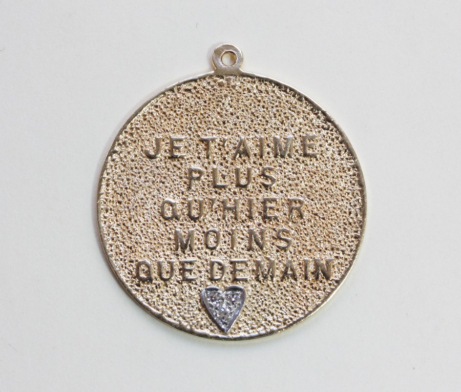 Een grote 14 karaat gouden bedel met de tekst je taime plus que hier et moins que demain boven een platina hartje bezet met drie kleine briljant geslepen diamantjes, gesleten signatuur: Merrin, V.S., circa 1970. m