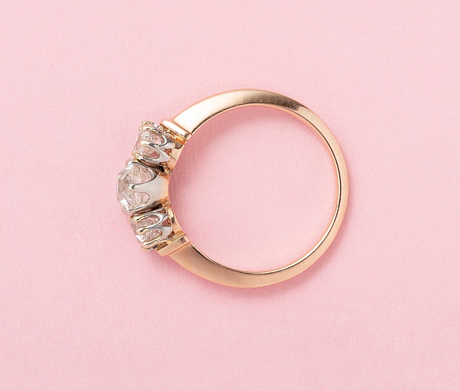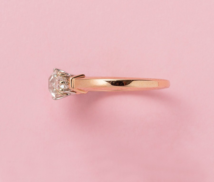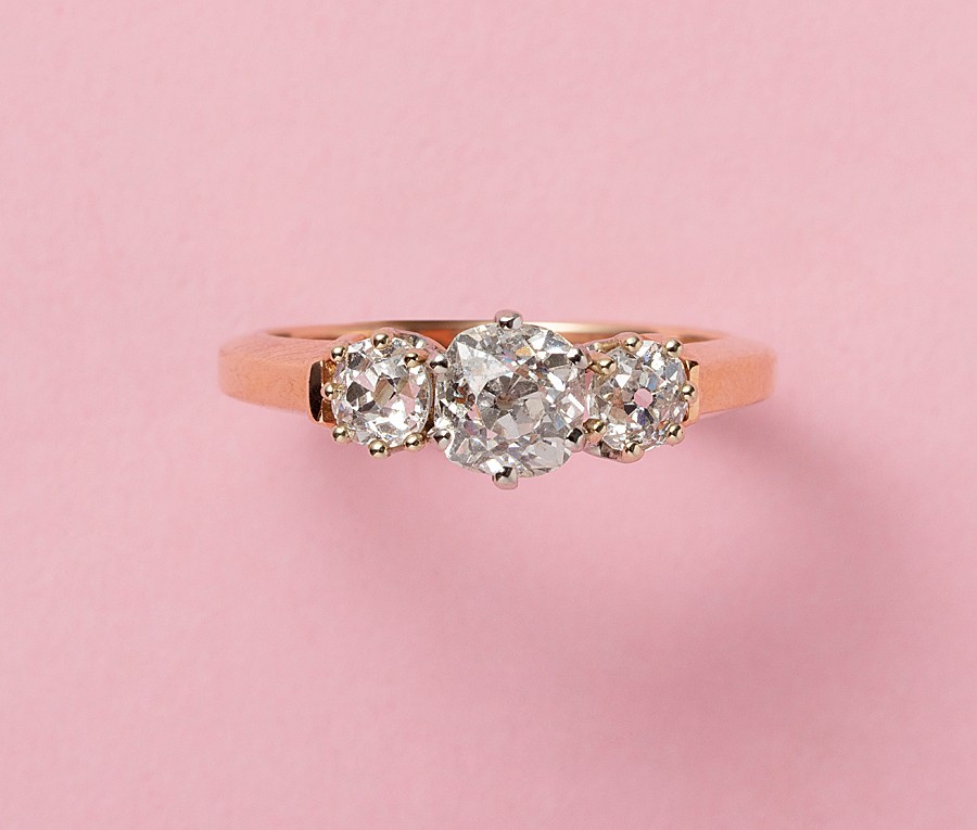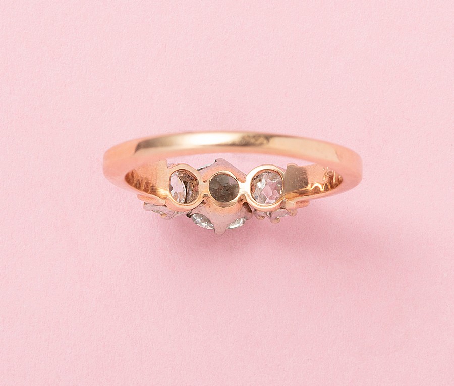 Een 18 karaat rosé gouden ring bezet met drie oud geslepen diamanten in witgouden chatons, (2 x 0.15 en 1 x 0.87 = 1.17 karaat F-G, Si), Frankrijk.