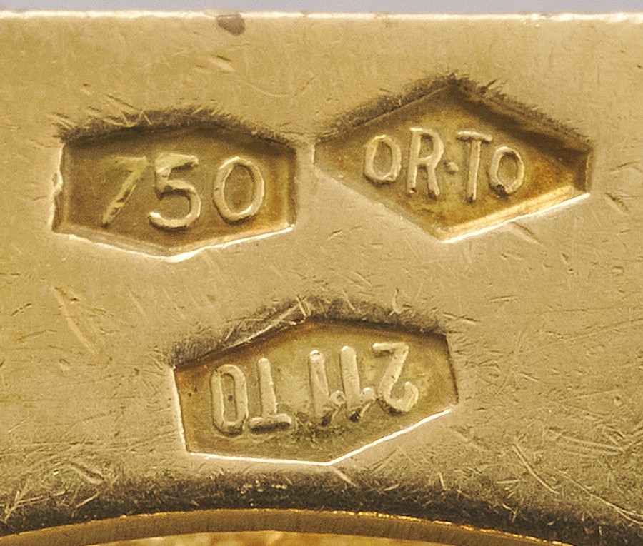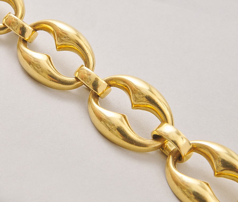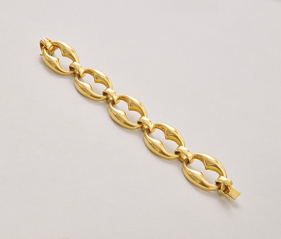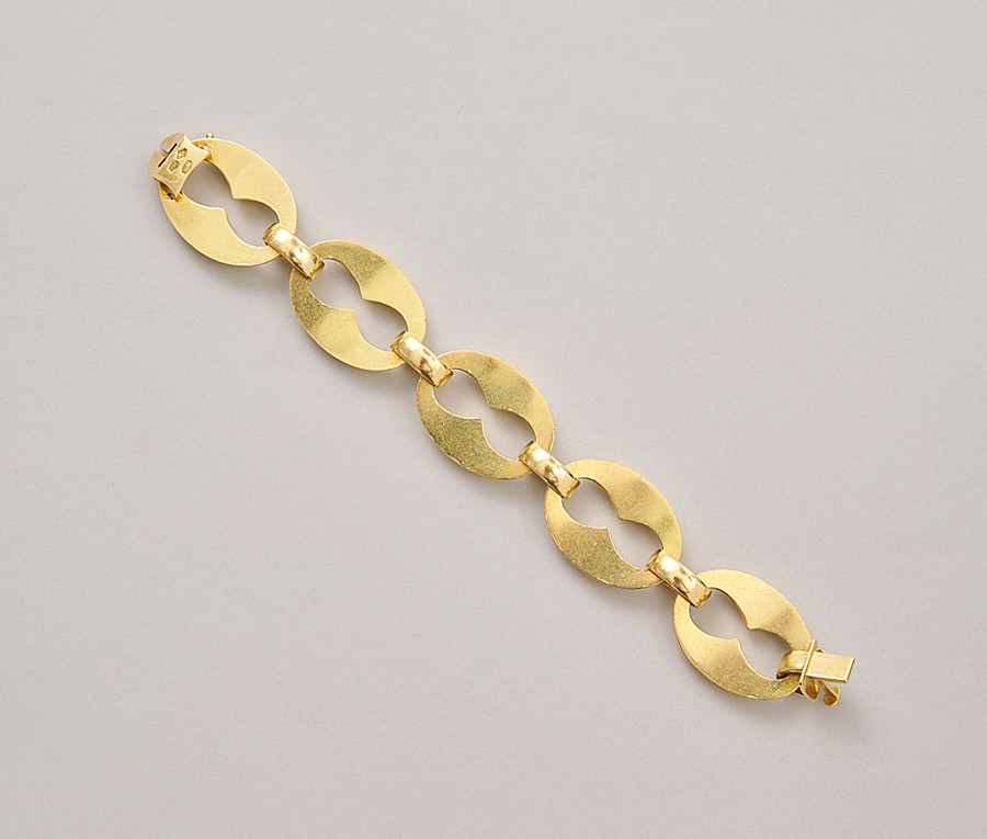 Een 18-karaats gouden armband met 5 grote mariner schakels afgewisseld met 6 gladde tussenschakels met in een een onzichtbaar bakslot met veiligheidsachtje, gekeurd met Italiaanse goudkeuren en met een Italiaans meesterteken en gesigneerd: Oreficeria Torinese di Ferrua Cacagno & C.