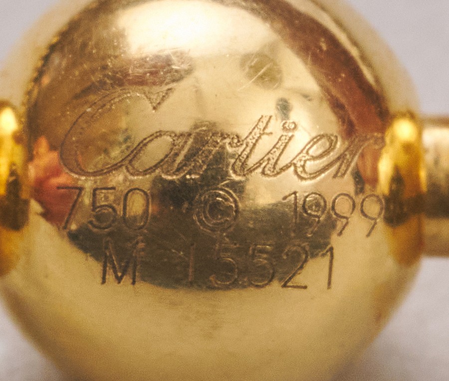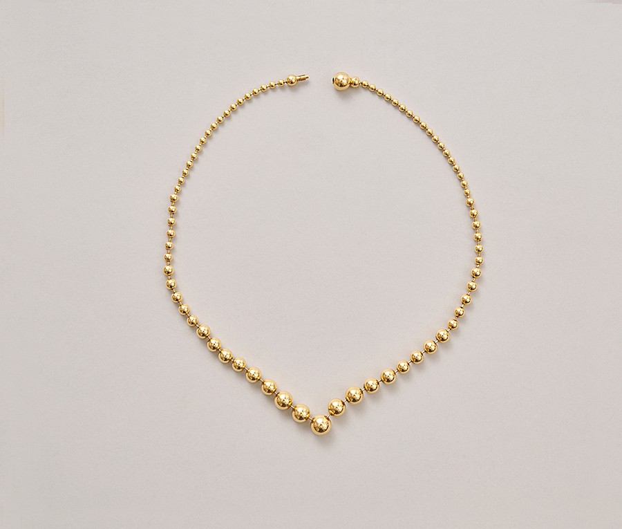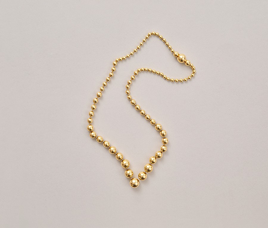 Een 18-karaats geelgouden ballen collier met oplopende maat bollen en een kleine punt in het midden, gesigneerd en genummerd: Cartier M15521.