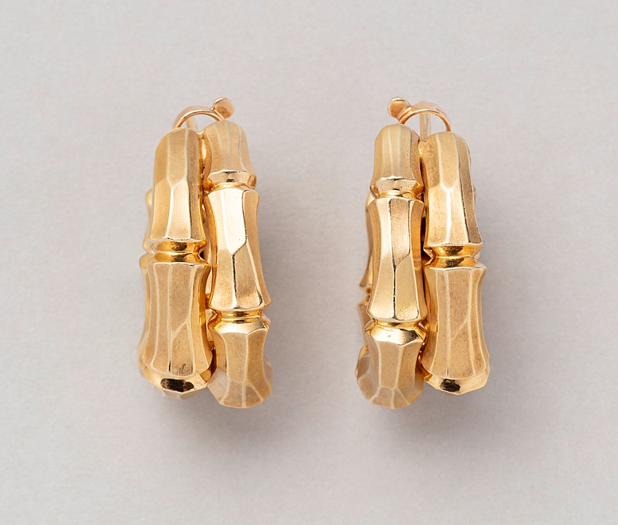 Een paar 18-karaats gouden dubbele bamboe oorbellen, gesigneerd en genummerd: Cartier, met Franse goudkeuren en meesterteken, Frankrijk, circa 1990.
