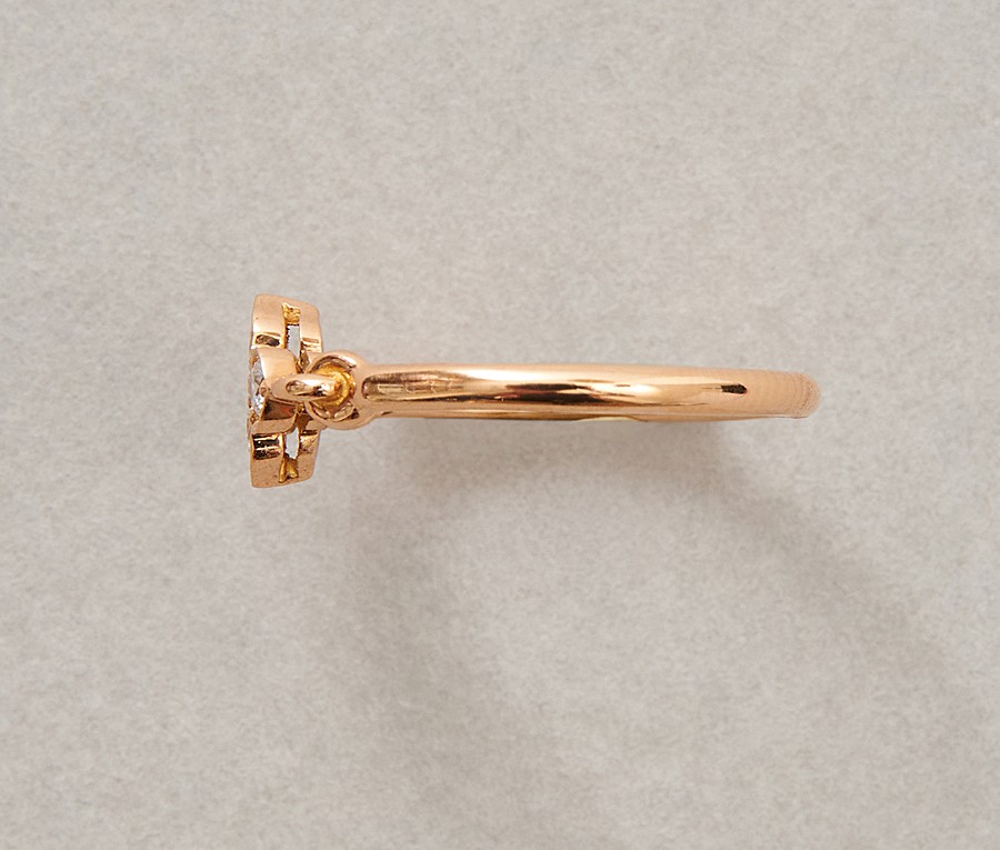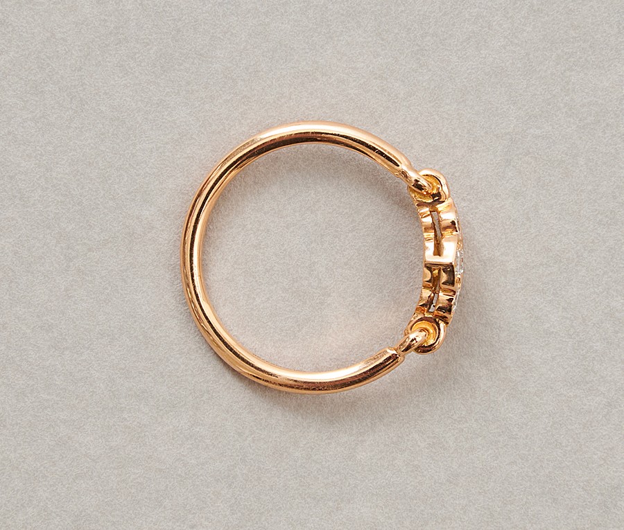 Een 18-karaats gouden ring met bloem bezet met 4 diamanten (circa 0.28 ct). De bloem en de scheen zijn verbonden met twee in elkaar gedraaide kleine ringen, gesigneerd en genummerd; Cartier, OS3766, model Hindu, met Cartier certificaat.