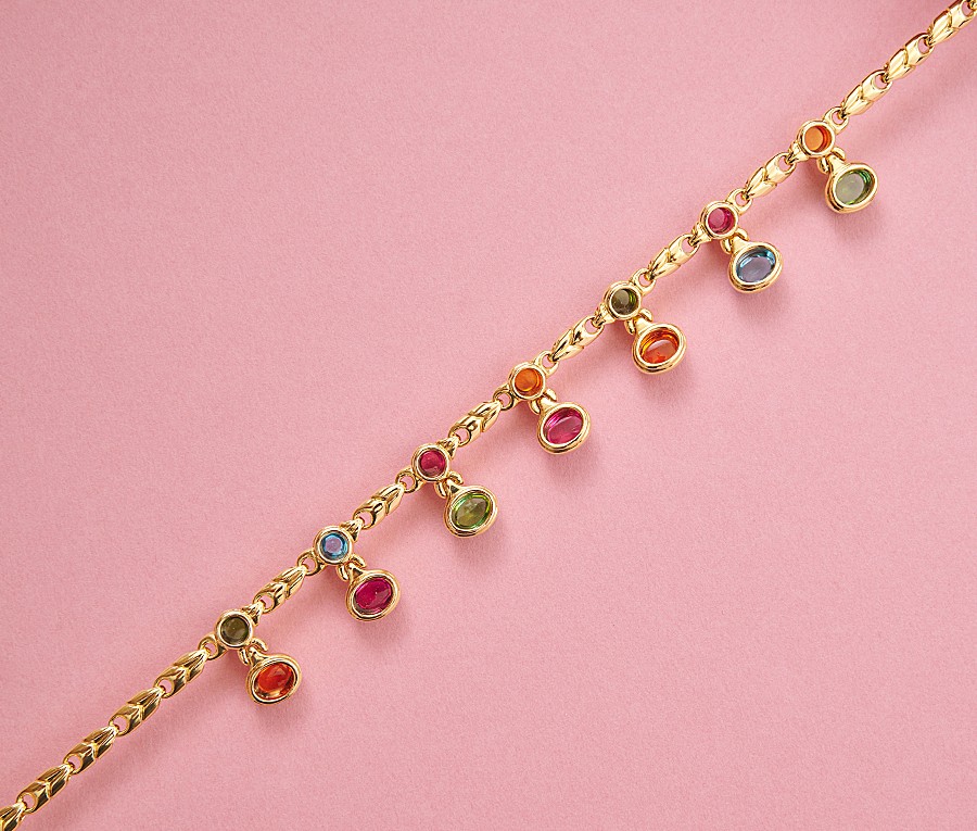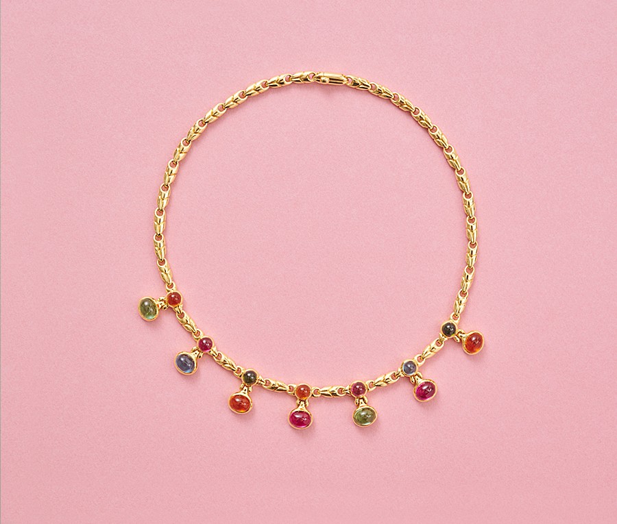 Een 18-karaats gouden ketting met edelstenen, een schakelketting en aan de voorkant bezet met cabochon geslepen citrienen, roze toermalijnen, groene toermalijnen en blauwe topaas, gesigneerd: Bulgari, met Italiaans keurmerk voor 18-karaats goud en een Italiaans merkteken van de maker, model ‘Passo Doppio’.