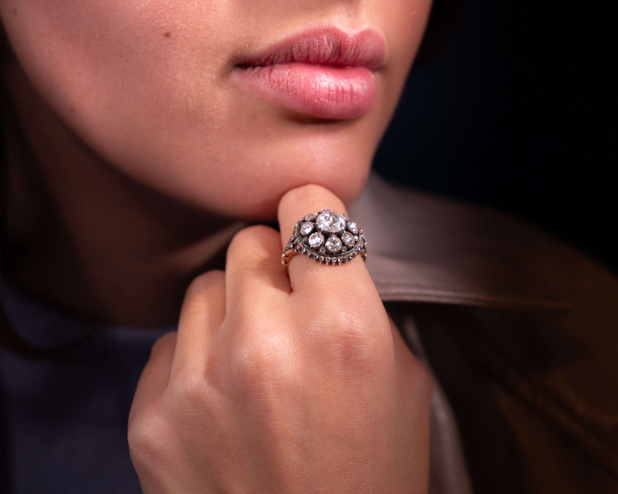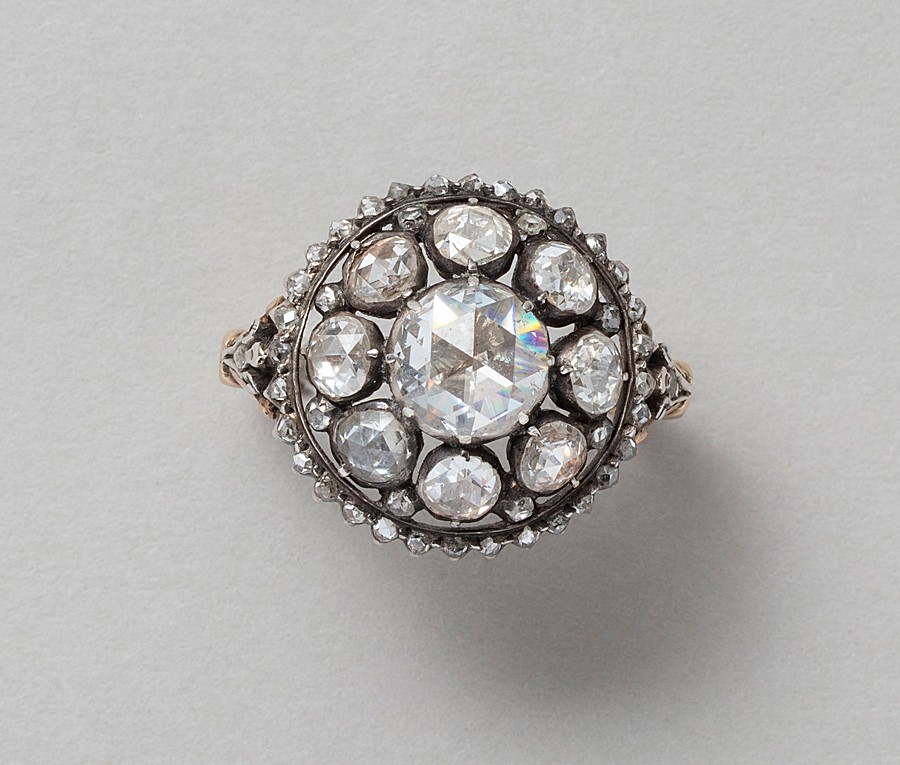 Een 14-karaats geelgouden en zilveren ring bezet met een grote rozet van roosdiamanten. De middensteen een ronde roosdiamant circa (1.2 karaat G, Si) waaromheen acht kleinere roosdiamanten (8 x 0.15 karaat H-J, P), en met nog een cirkel van kleine roosdiamantjes rondom de rand, Nederland.