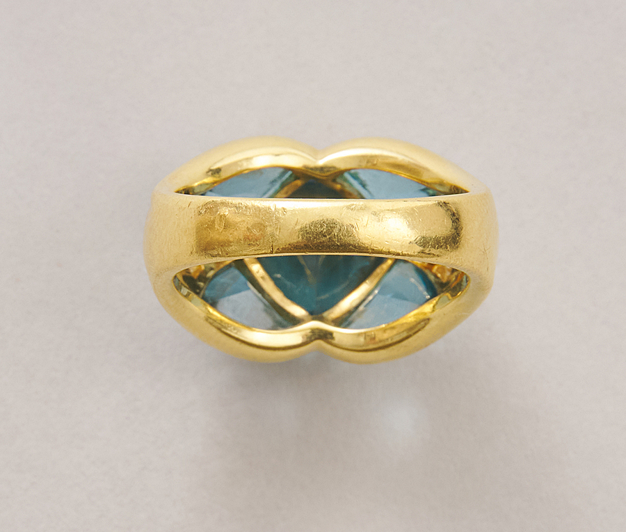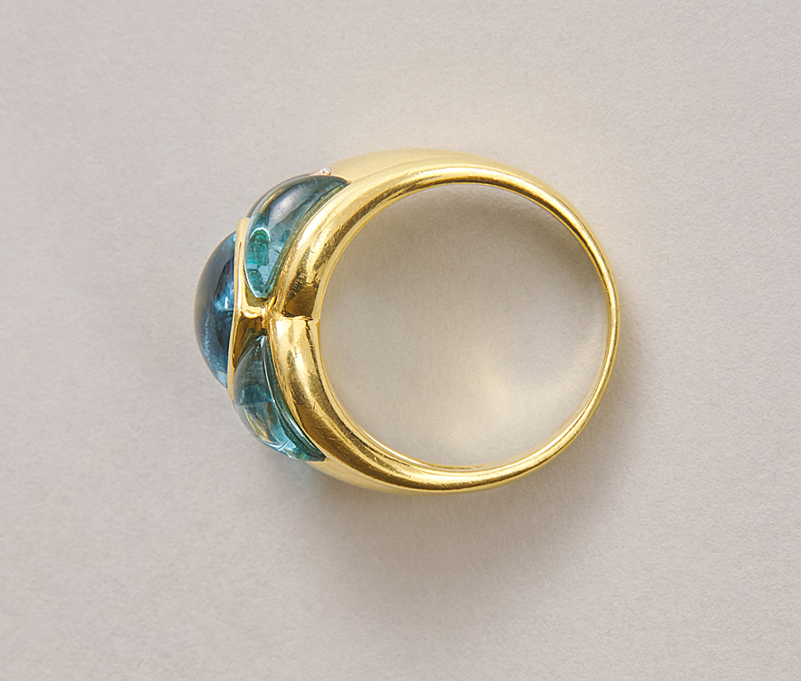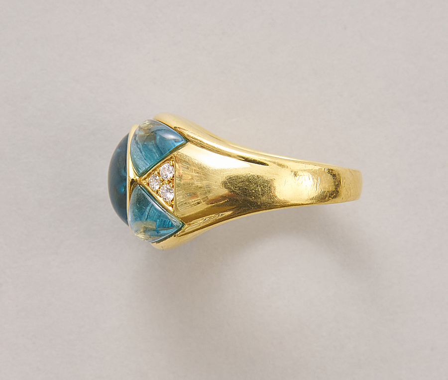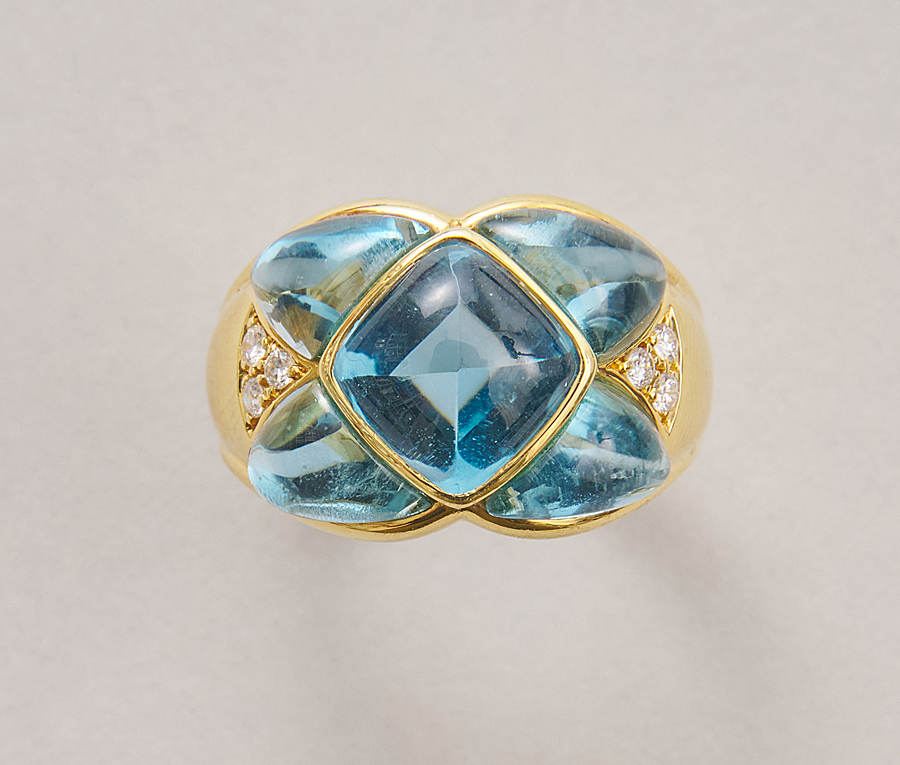 Een 18-karaats gouden band ring, bezet met een vierkante cabochon geslepen topaas, omringd door vier driehoekige cabochon topazen. Aan beide zijden van de scheen, tussen de twee cabochons, zijn drie briljant geslepen diamanten gezet (circa 0.06), Italië, meesterteken *1813AL voor New Italian Art Srl.
