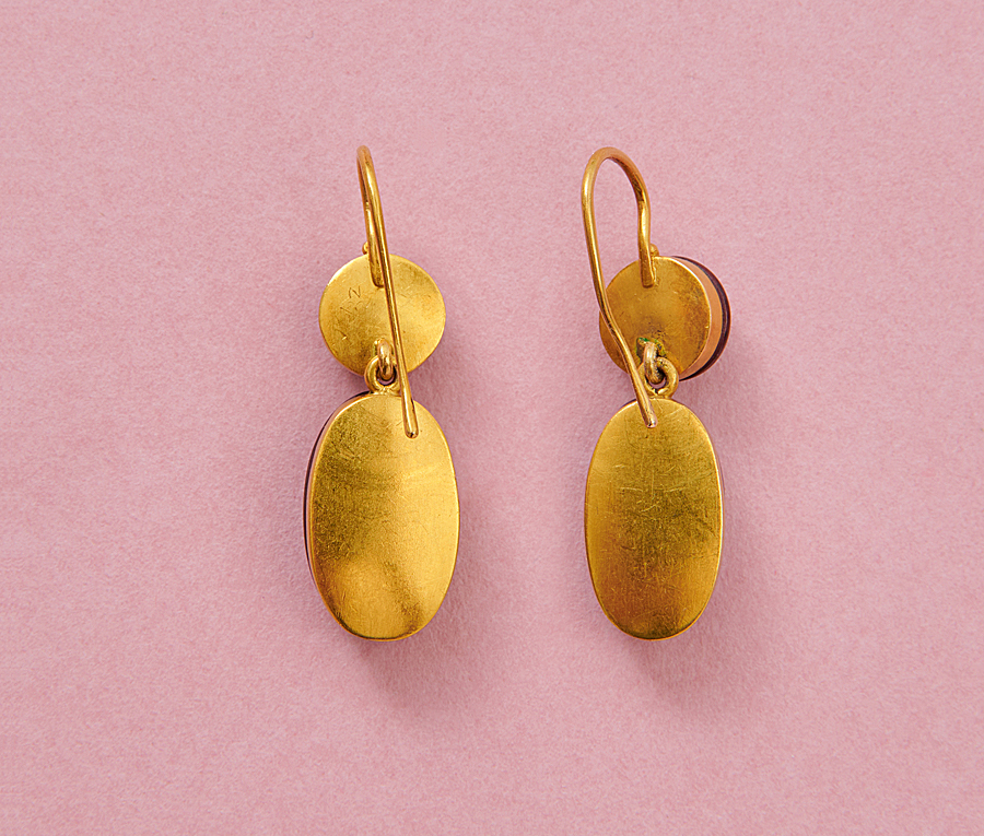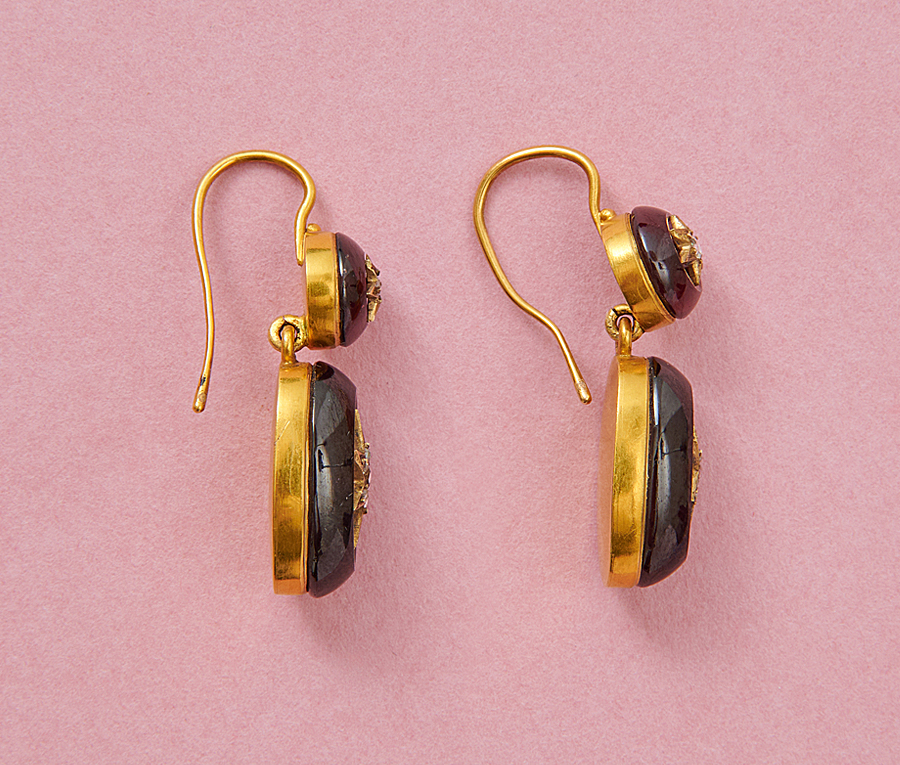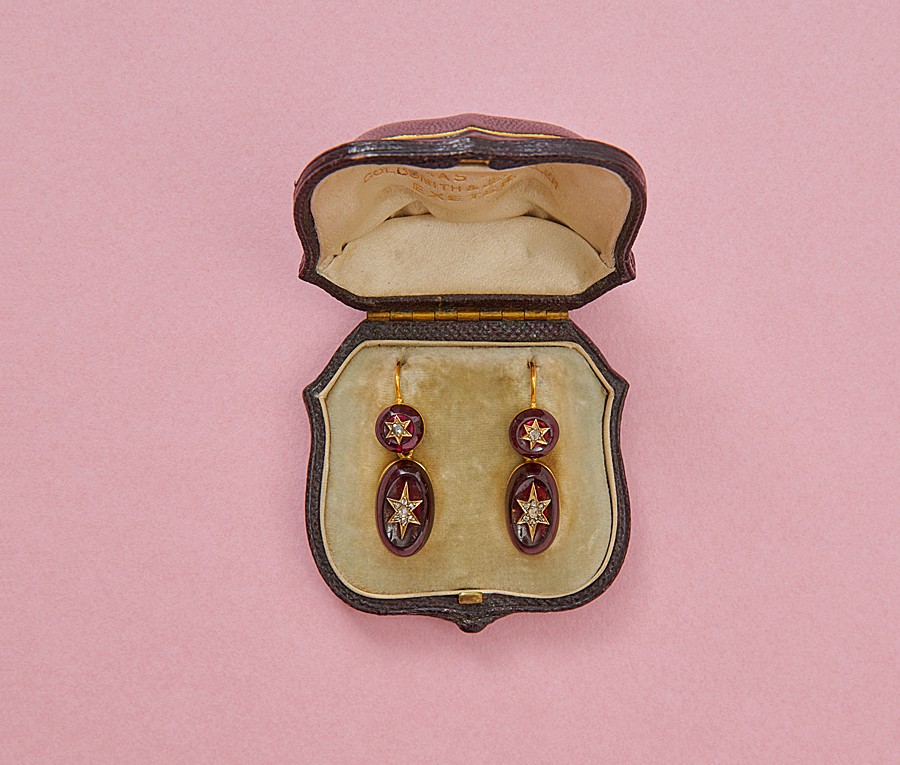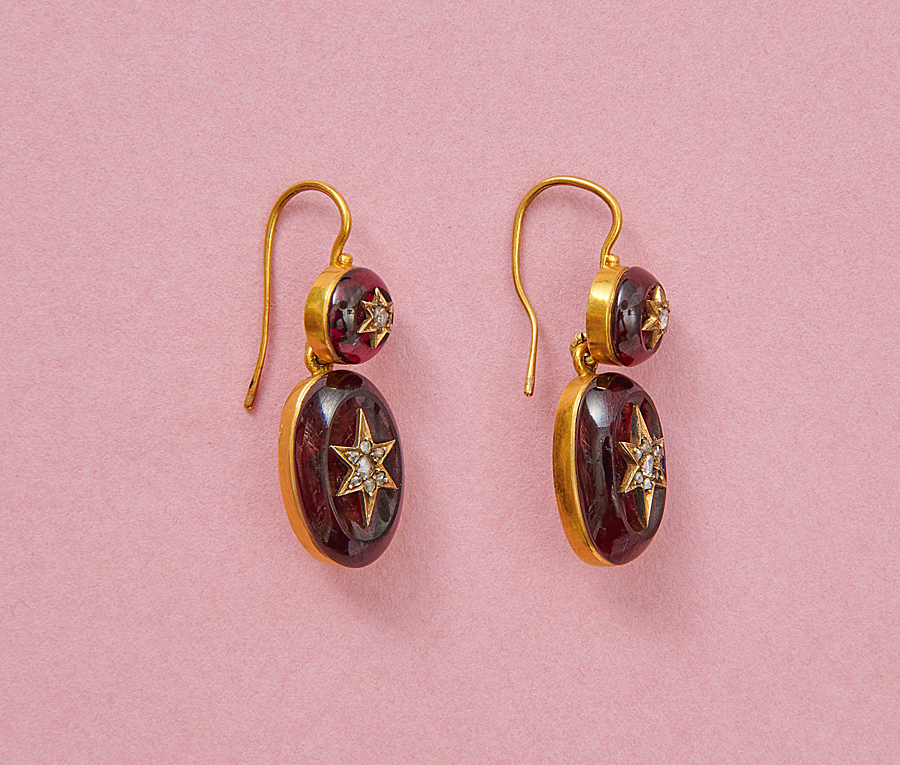Een paar 15-karaats gouden (gekeurd als 14-karaats) oorbellen met granaat en sterretjes bezet met diamant, Engeland, circa 1880.