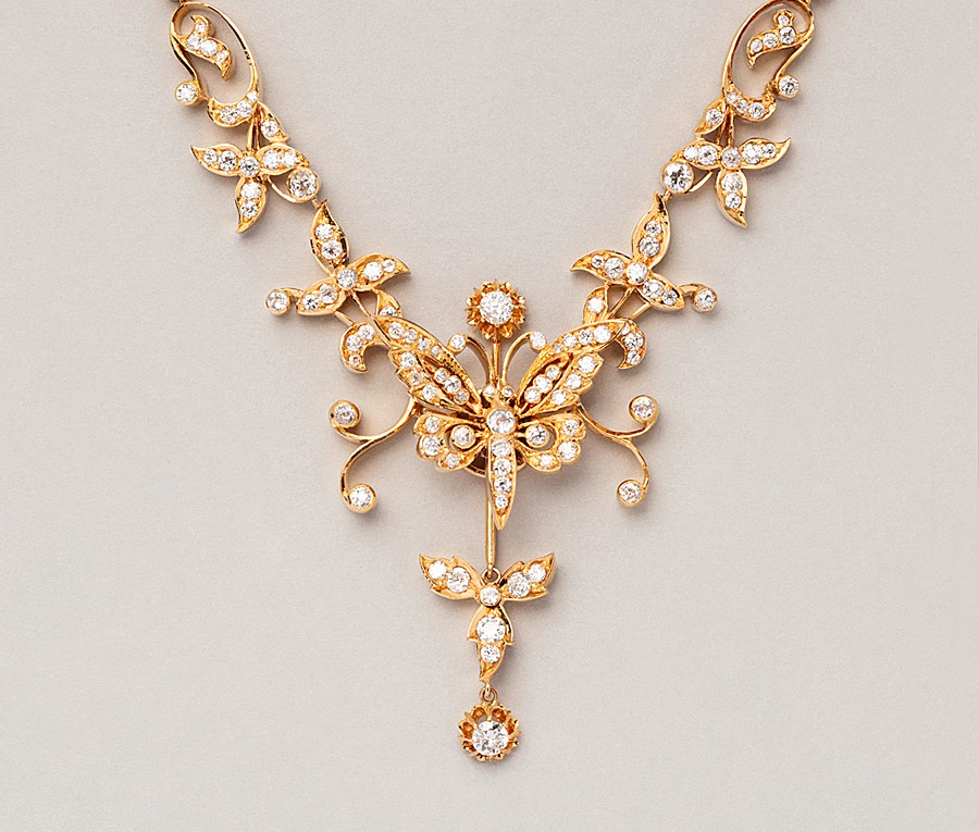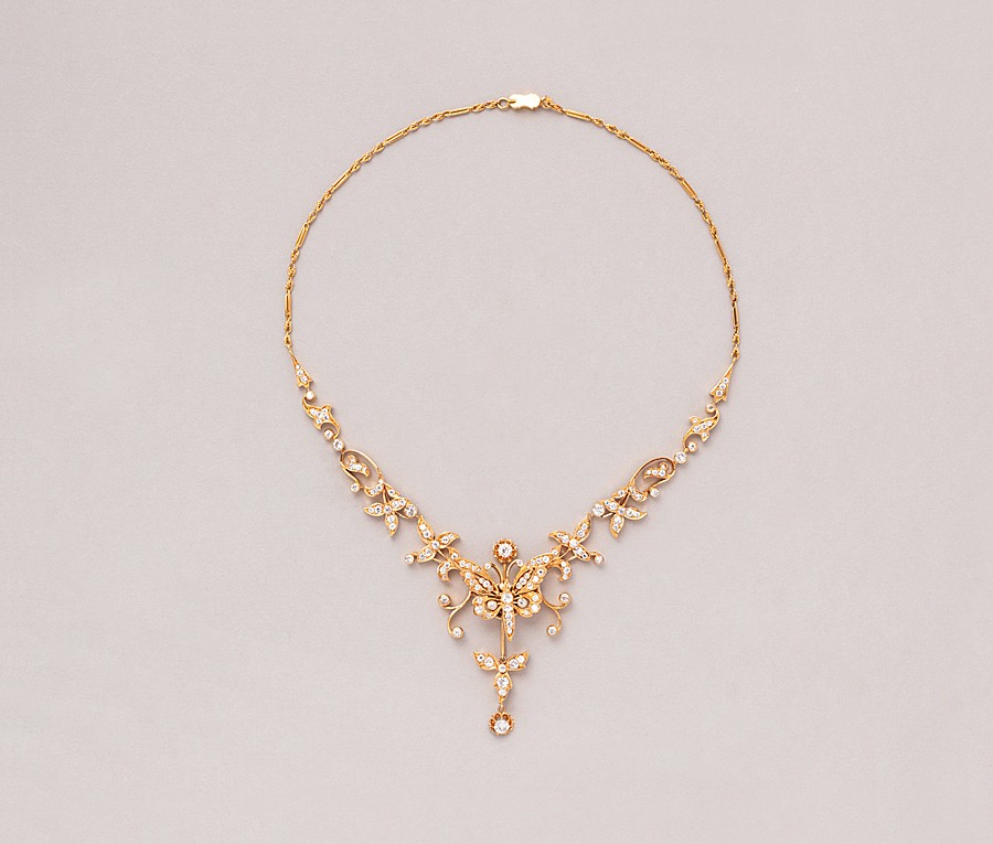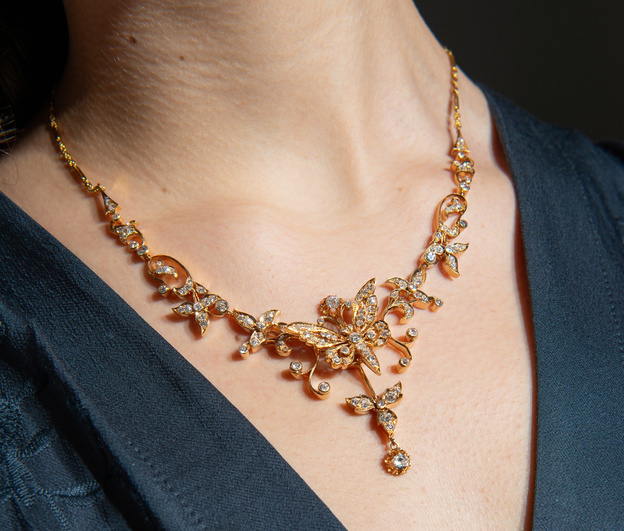 Een 18 karaat gouden collier bezet met oud geslepen diamanten in een gouden vlinder (en tremblant) met bloemen, krullen en bladeren bezet met oud geslepen diamanten ook (circa 10 karaat), India voor de Engelse markt, eind 19e eeuw.