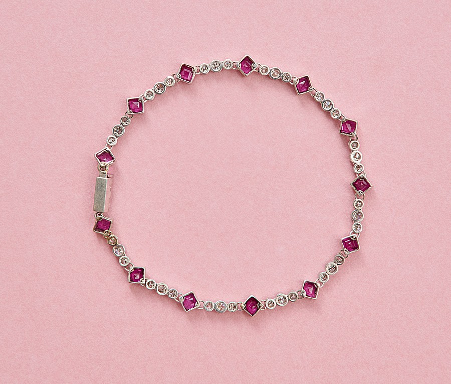 Een platina en 18k gouden armband met afwisselend een French cut geslepen robijn (13 stenen en totaal circa 2.34 ct) en 3 brilliant geslepen diamanten (36 totaal circa 1 ct), Frankrijk, circa 1920.