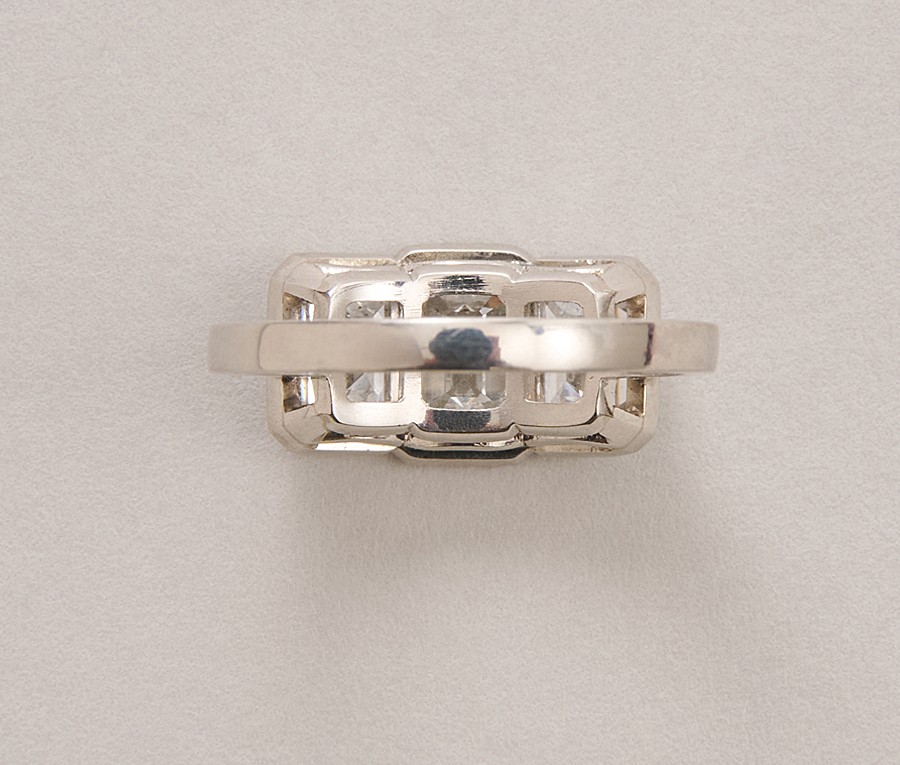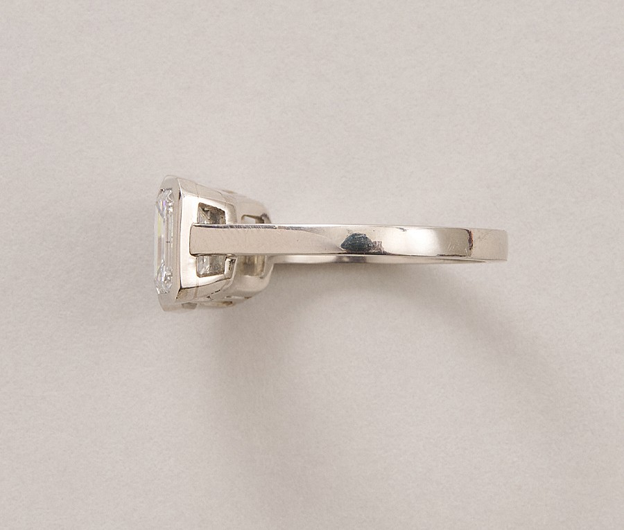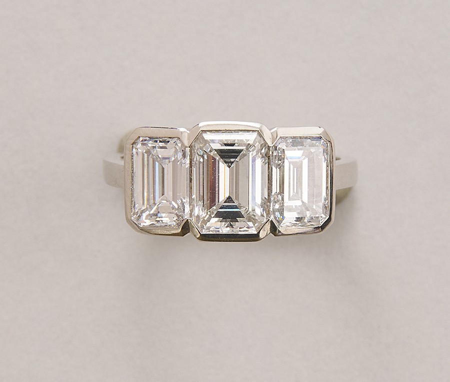 Een platina ring met drie smaragd geslepen diamanten op een rij in een gladomzetting aan de buitenrand, de middelste diamant iets groter (middensteen 1.4 crt G, Si1 met aan weerszijde twee stenen van 1 crt F-G, Vs2, totaal circa 3.40 karaat).