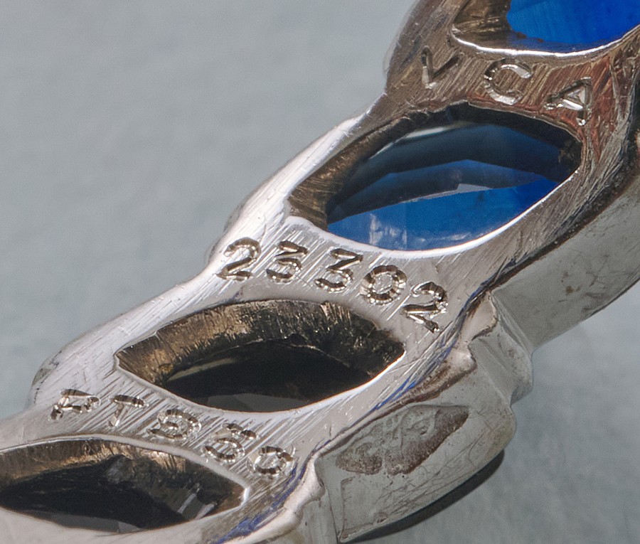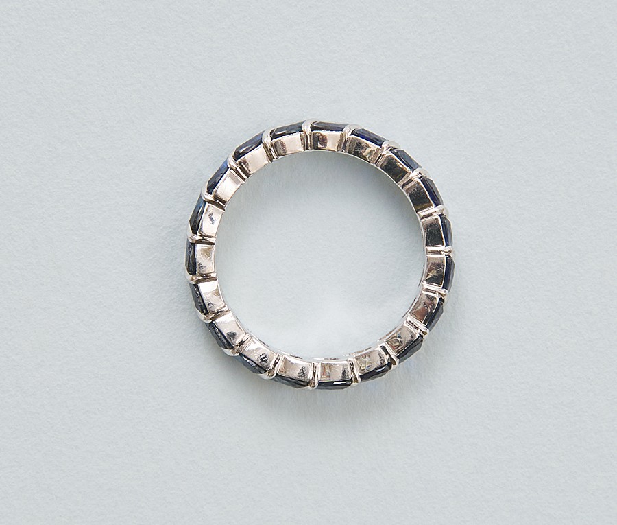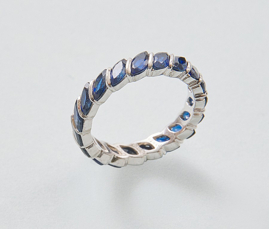 Een platina eternity ring met navette geslepen saffieren (circa 2.47 ct), gesigneerd en genummerd, VCA voor Van Cleef & Arpels, 23302. Frankrijk.