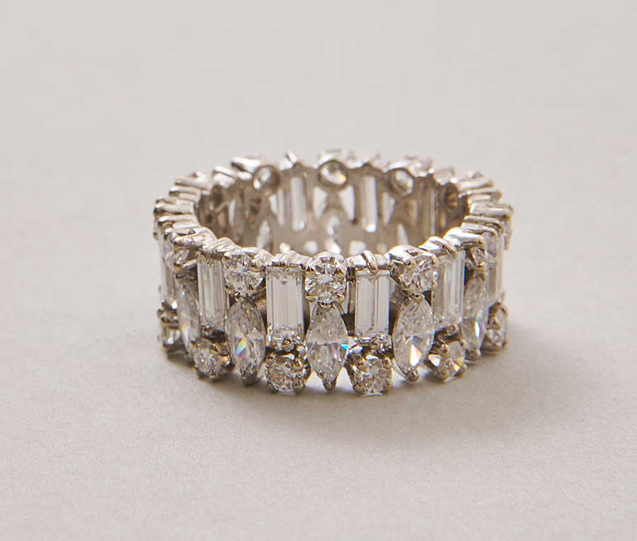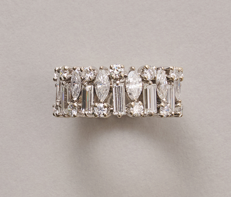 Een 10-karaats witgouden, brede band ring bezet met verschillend geslepen diamanten (12 x 0.12 crt baguette, 12 x 0.12 crt markies, 24 x circa 0.04 crt, en in totaal circa 4 crt, F-G, waarschijnlijk Engels.