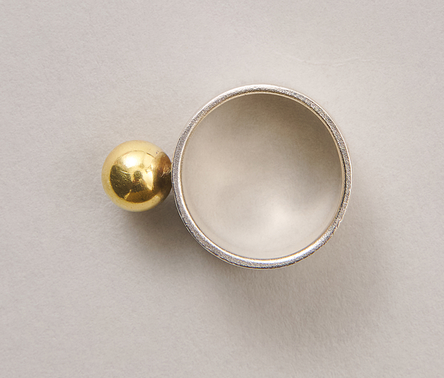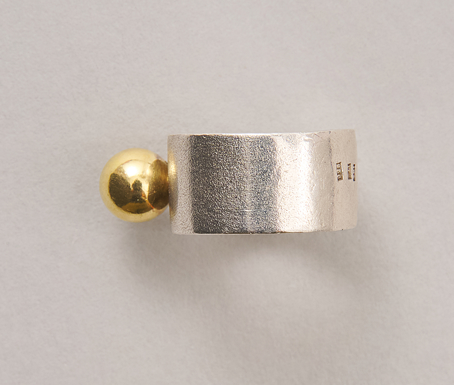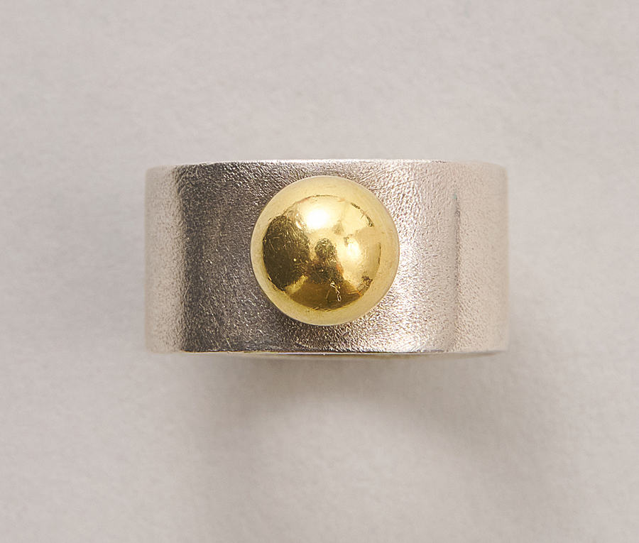 Een zilveren brede gladde band ring met een 18-karaats ronde gladde gouden bal, meesterteken ITS, Zweeds, circa 1960.