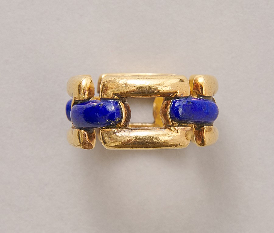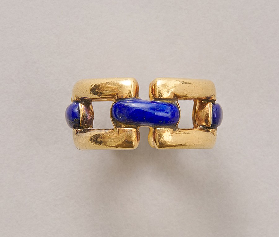 Een 18-karaats geelgouden vaste schakel ring met vier horizontale balkjes met ingelegde Lapis Lazuli, gesigneerd en genummerd: Mauboussin Paris 23851.