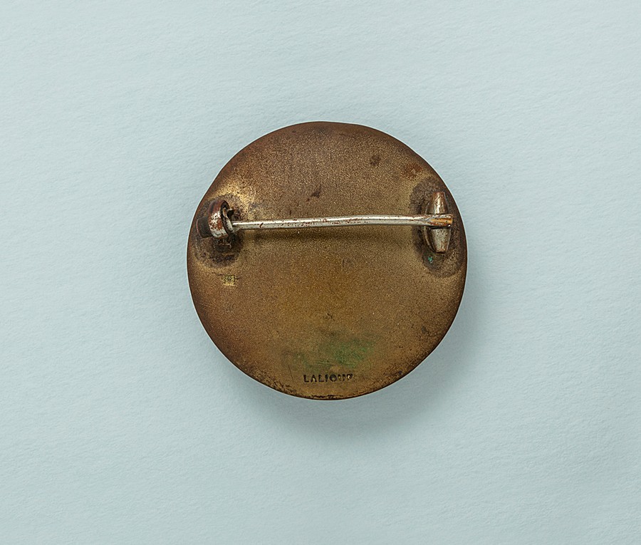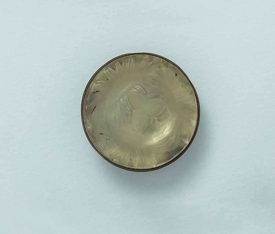 The ‘Trois Marguerites’ brooch with a light green circular stained relief foiled glass cast depicting marguerites mounted in gilt metal, signed and with Maker’s mark ‘LALIQUE’ to the metal mount for