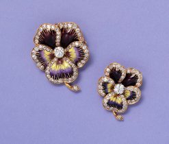 An18 carat yellow gold pansy brooch and pendant with enameled leaves, in purple, yellow, lilac and dark purple surrounded by a border with old cut diamonds and a bigger one in the center (center stone: app. 0.7 F-G Si, and in total app. 2.2 carat), attributed: Tiffany, American, circa 1900.