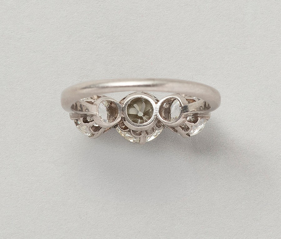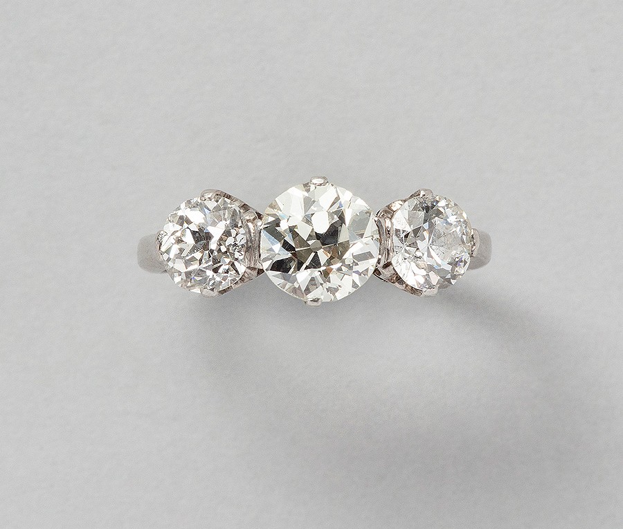 A platinum three stone ring set with three old brilliant cut diamonds (center stone app. 1.30 ct L-M, Si with two 2 side stones app. 1.40 ct, H-I, Si, total weight app. 2.70 ct), circa 1920.