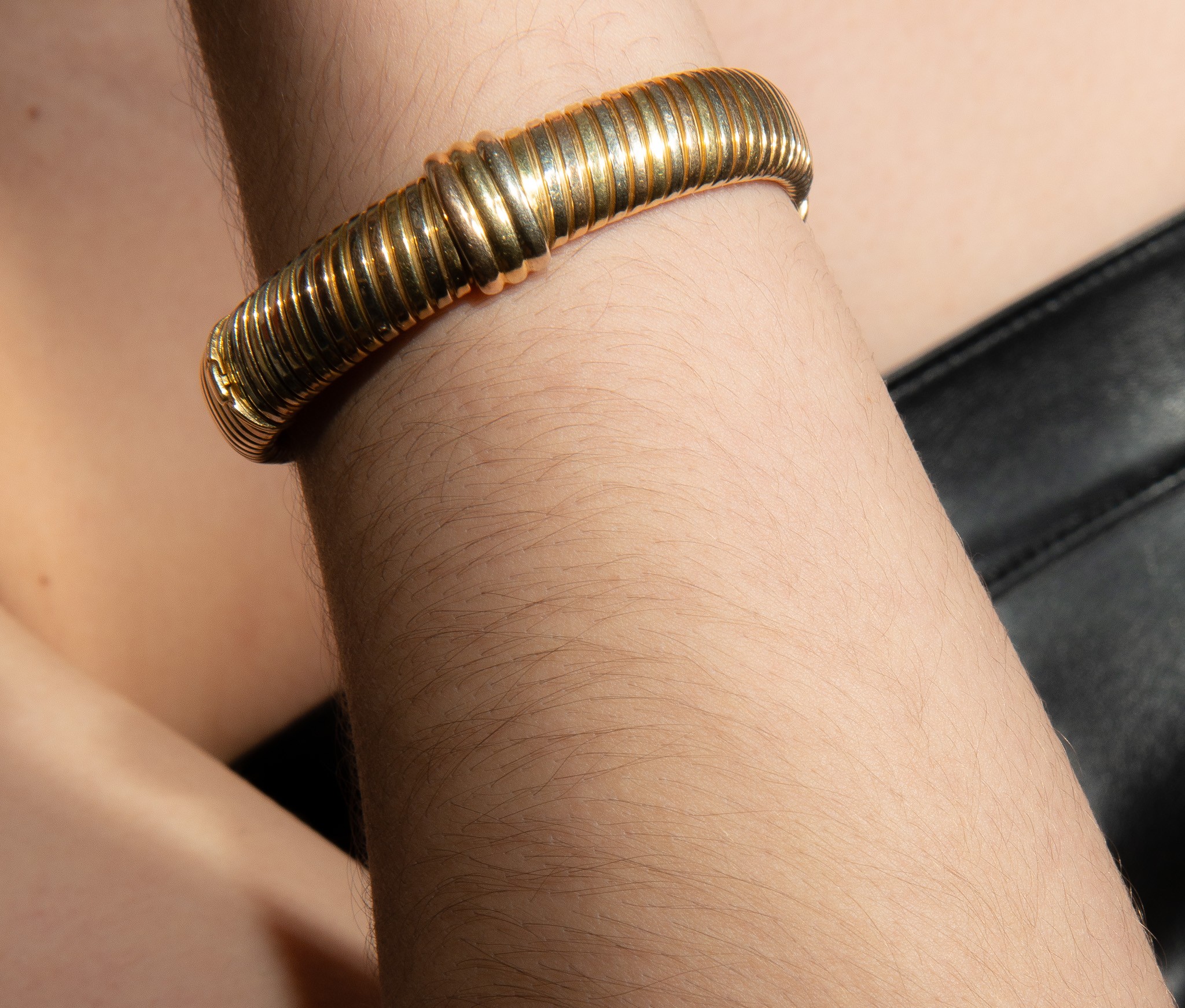 An 18 carat trinity gold tubogas bracelet with a three-colored band in 3 places, signed and numbered: Cartier, 766549